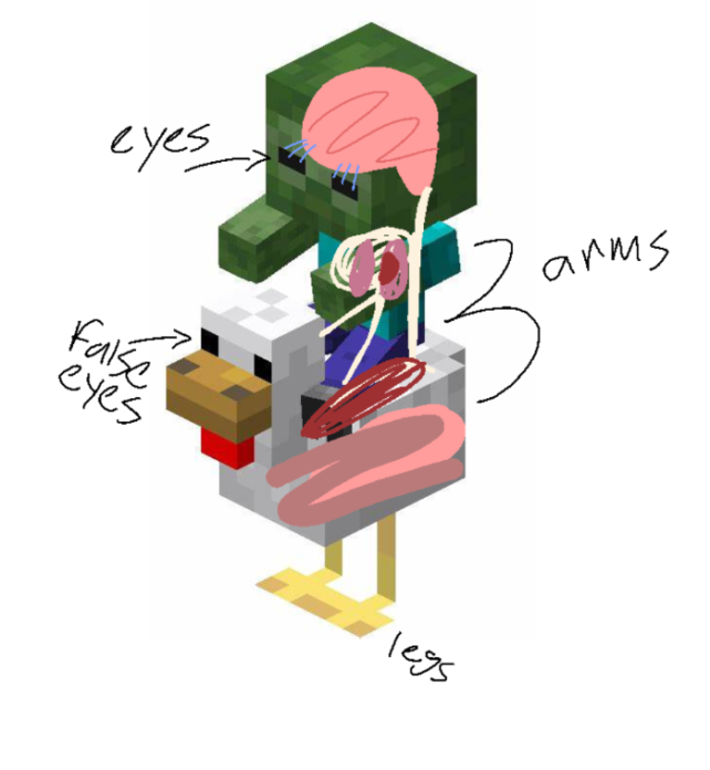 Texiyas is well known for its variety of wildlife, but something never seen before has been spotted there. A Chicken Jockey. Chicken Jockeys are so rare that most people do not even know what they are, much less have seen them. A Chicken Jockey is a small, fat, white bird with a yellow beak and legs that has a small humanoid creature on it, which some researchers have dubbed as "Baby Goblins." Neither of these creatures have ever been seen apart and it is speculated that they are in fact attached to one another. I will include a diagram of the proposed internal anatomy of a Chicken Jockey. A team of scientists was deployed to the area, but when they got there, it was gone. The Chicken Jockey was discovered by a birdwatcher named Carlos Crinkledinkle, on his annual summer trip to Texiyas to see migratory birds, when interviewed he stated “It was the most incredible, grotesque thing I’ve ever seen. Birds should not look like that, and yet it does.” Scientists are still in awe of this wonderful, rare creature, and hope to discover another one whenever possible.